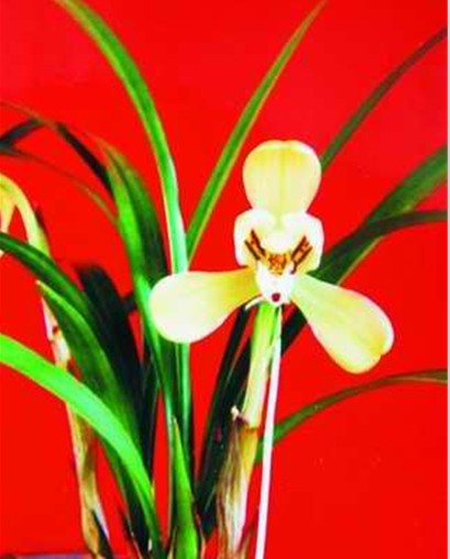 专家评语:本品于2004年在贵州下山的春兰原生种中选出,复花已5次,为黔系梅瓣新品。三瓣质糯,收根,紧边,蚕蛾捧,刘海舌,舌端有一红点,花色呈奶黄色,花莛、苞叶为红色,苗壮时双花,花容端庄秀丽。经多年栽培,性状稳定,同意登录。